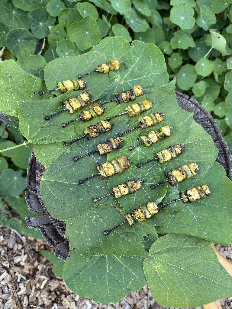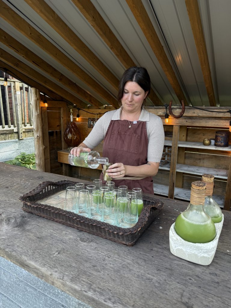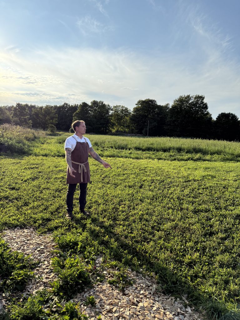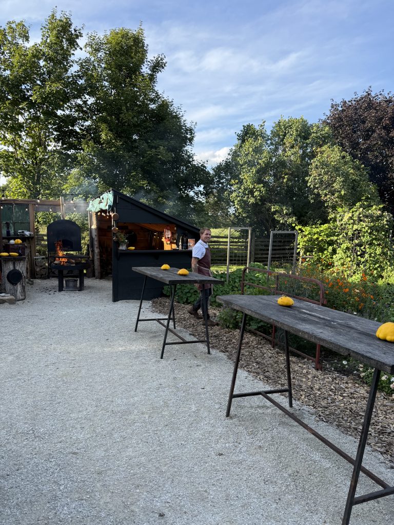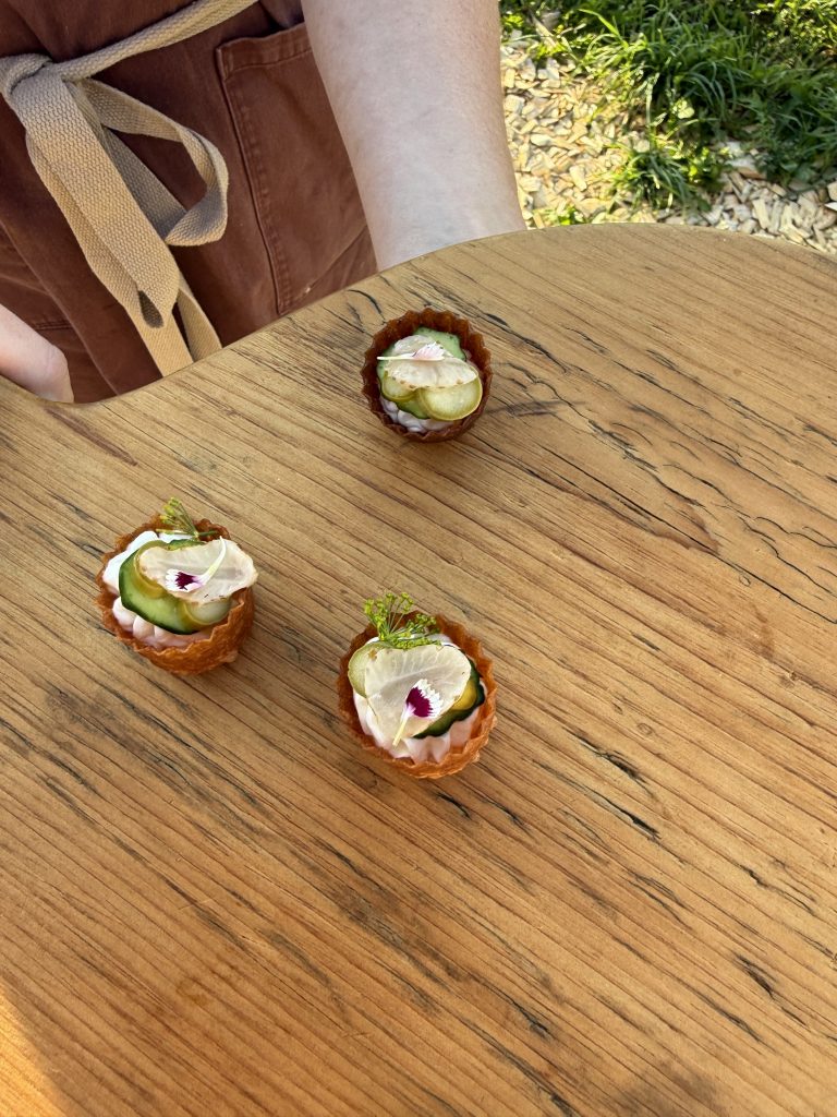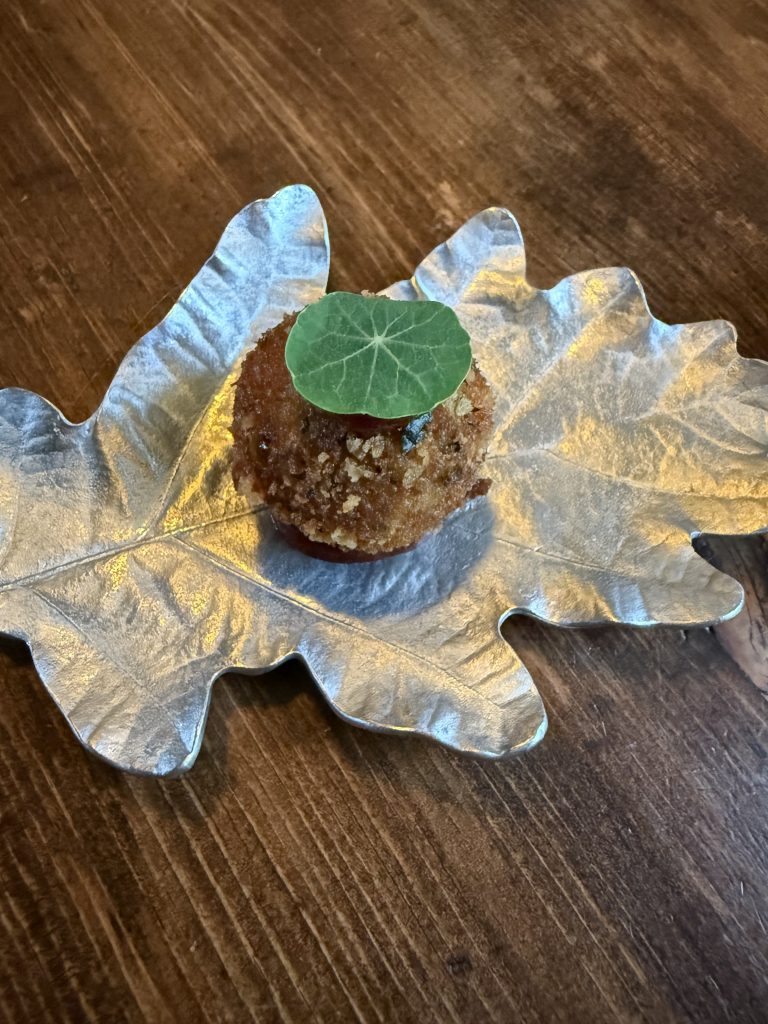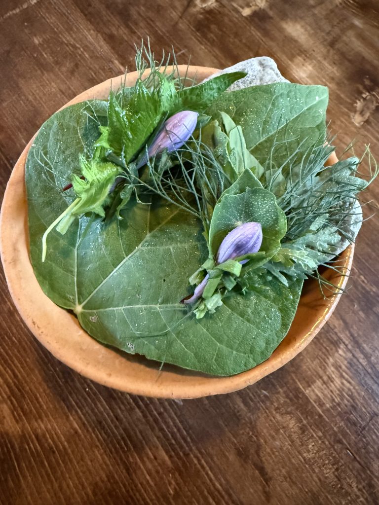 Down Home feels a bit like a spiritual successor to Eigensinn Farm, though here the eccentricity has been traded for more polish. Guests are greeted not at a hostess stand but in the garden, where the meal begins beneath blue sky dotted with clouds. Wild herbs and edible flowers brush against your legs as Hannah offers a welcome cocktail: apple, cucumber, and mint juice laced with gin — bright, cold, and as green as the view. He gestures toward the garden beds and invites you to pick a single nasturtium leaf, peppery and satin-smooth, to use as a wrap for a torched shishito pepper he’s just lifted from an open flame. The act of foraging your own garnish is playful but grounding, an initiation into the evening’s rhythm. The experience is tactile, sensory, immediate: the smoke from the fire, the sting of mint, the faint hum of bees. By the time you’re ushered indoors after a small selection of amuses bouche, you already feel part of something alive and deeply local.