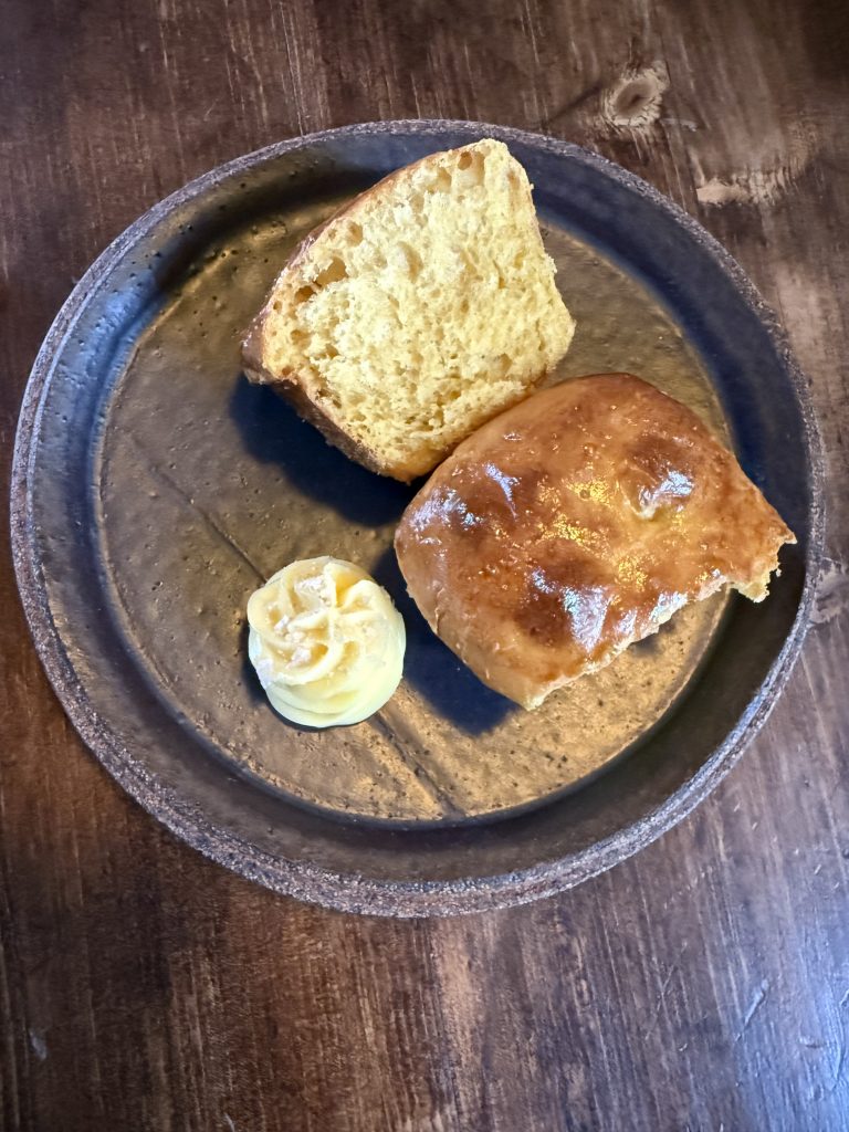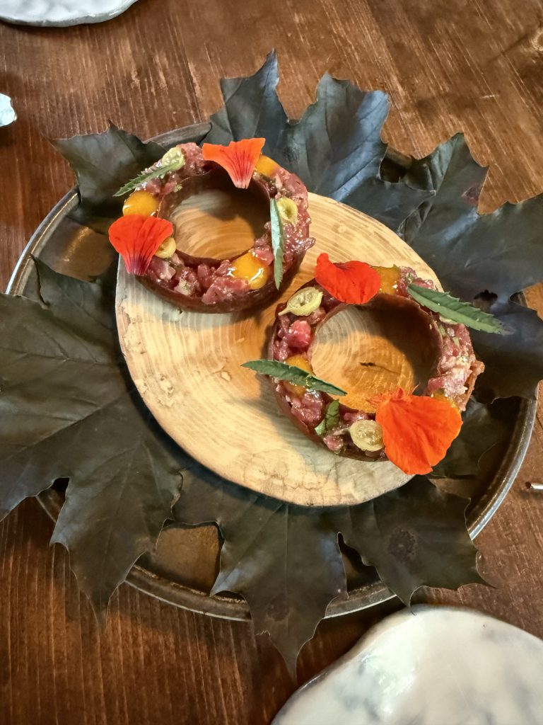 The blind tasting menu is an unfolding narrative of place. It begins with the beef tartare, finely chopped decorated with edible flowers and herbs from the garden. Then, a pea and blue cheese croquette, crisp on the outside and molten within. Sweet potato buns arrive warm and airy, paired with salted maple butter that melts into the crumb like silk.
