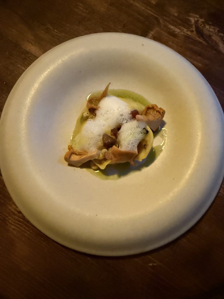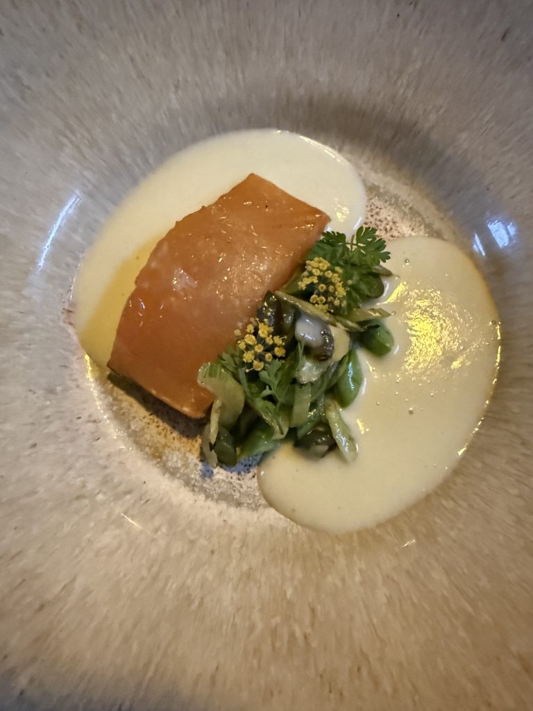 A dish called “The Garden” follows. A riot of colour and texture that feels like eating the landscape itself. Every petal, sprig, and shoot is placed with purpose. You can taste the proximity — the morning’s dew, the echo of sunlight. The smoked Arctic char arrives next, tender and luminous with potato cream poured around it, flanked by crisp garden beans. The smoke is a whisper, the texture so delicate it barely holds its form on the fork. A seabuckthorn sorbet with buttermilk follows — cold, sharp, cleansing — before giving way to corn and chanterelles, buttery and golden, the sweetness of the corn deepened by the mushrooms’ forest musk.
