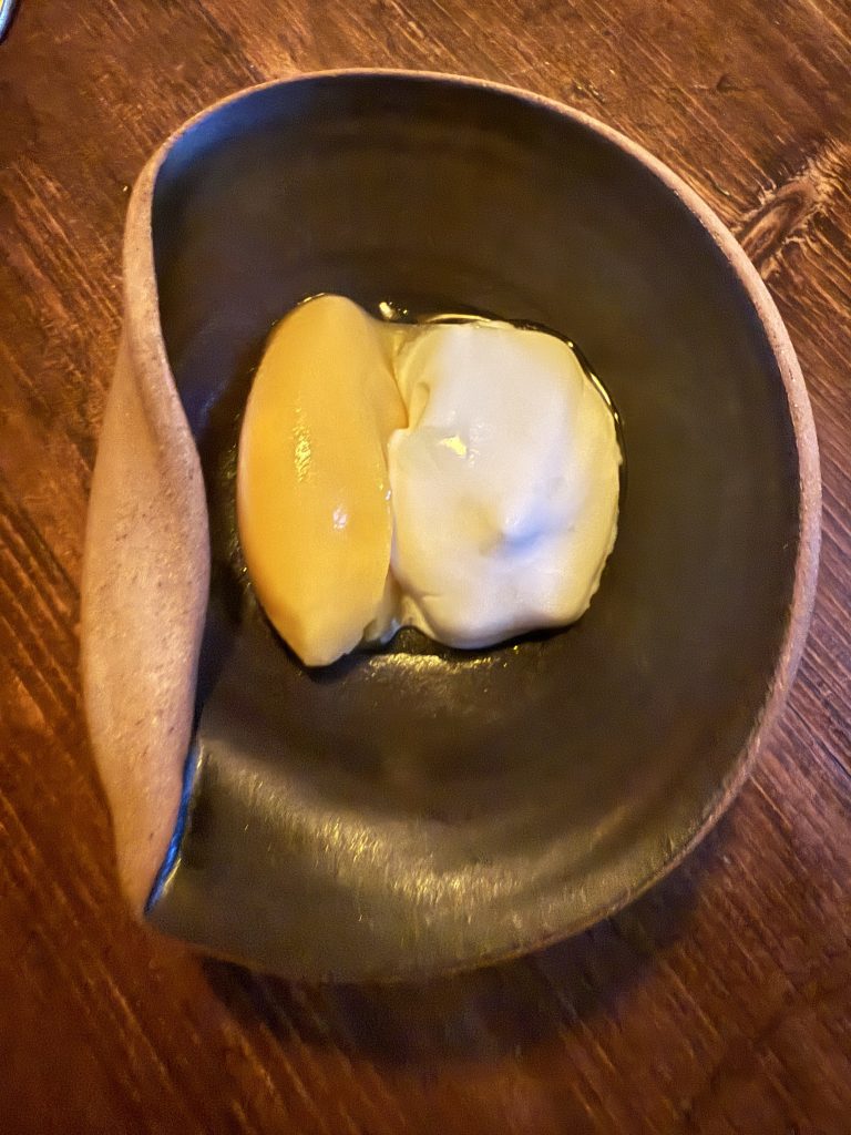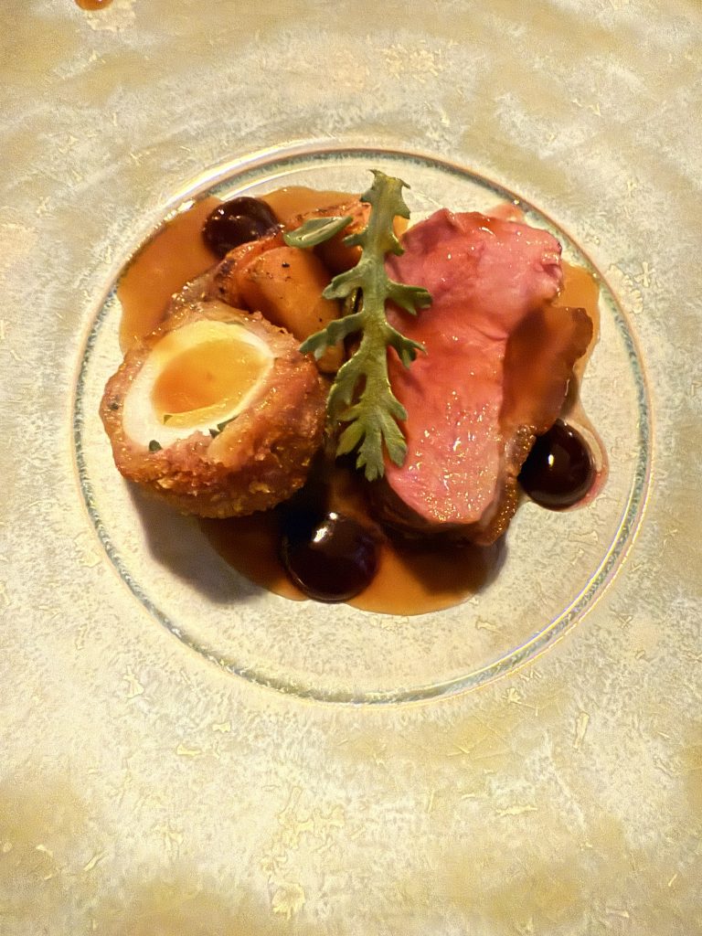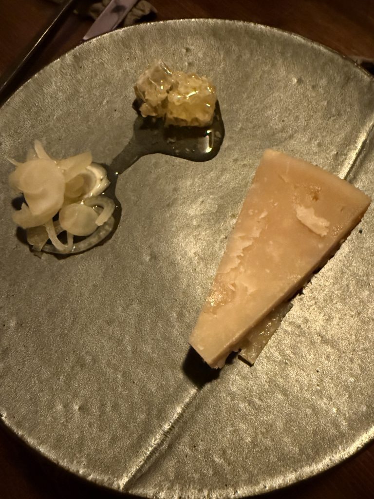 Then, the main event: Brilliant Meadows duck, its skin lacquered and crisp, the meat tender and perfumed with thyme. A scotch quail egg sits beside it, yolk still molten, a tiny nod to indulgence. A shared Secret Lands Farm Pecorino board is an optional add on for $20. The rich honeycomb and preserves bridge savoury to sweet, before dessert arrives: peaches and cream, reimagined. The fruit is gently caramelized, the cream feather-light, the dish both nostalgic and modern, but the portion was small.