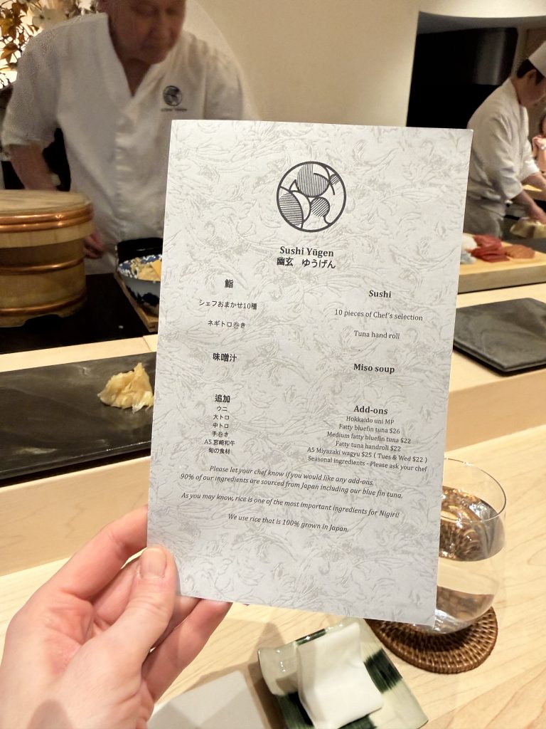 Dinner expands the scope. Sushi Yugen offers a counter dinner service at $98 per person, as well as a chef’s counter experience priced at $275 per person. The latter is a meticulously crafted 16-course tasting, beginning with kaiseki-inspired dishes before transitioning into refined omakase sushi. Each course is prepared and served personally by the head chef, and all ingredients are sourced directly from Japan. It is designed as a singular, immersive experience. Service was professional and impeccable, although if you’re looking for small talk with your server, this is not the place.