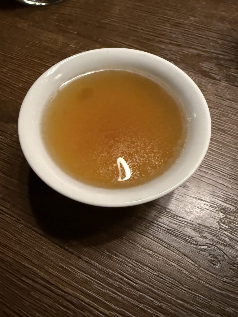 The meal begins gently, as most good stories do. A clear broth arrives first, made from mature duck and pear. It is pale, fragrant, and quietly restorative, the kind of soup that seems designed to slow your breathing. The pear lends a faint sweetness; the duck adds depth without heaviness. It tastes like patience. If this were all that was served, I would already feel looked after.