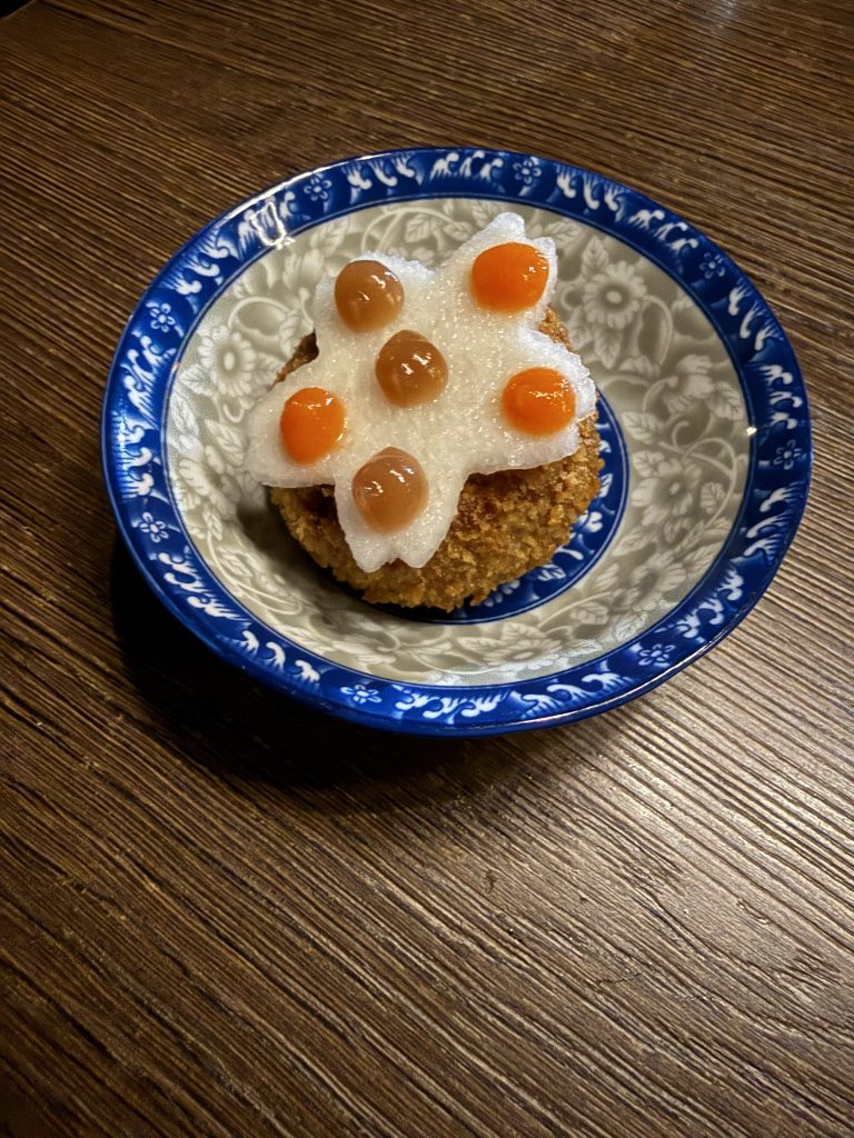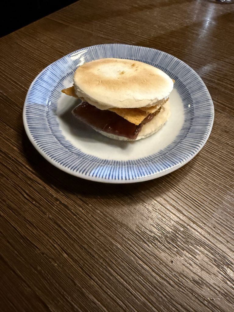 Small snacks follow, a constellation of compact, concentrated flavours. An oyster shot dressed in Chaoshan-style seasoning lands somewhere between briny and gently funky. A croquette flavored with fermented bean curd delivers a creamy interior that blooms into savory richness. Cured ham, hongshao carrots, and other bite-sized offerings flicker across the table like opening credits, introducing themes that will reappear later: fermentation, preservation, sweetness balanced by salt, the pleasure of restraint.