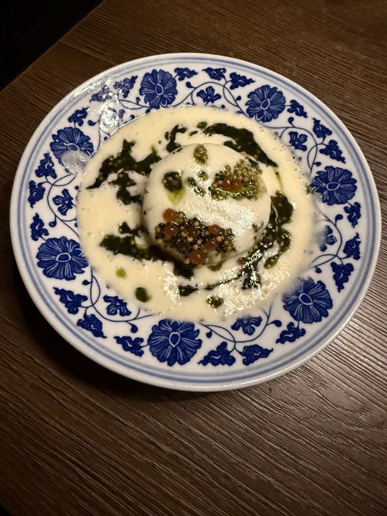 The filling is rich, juicy, and deeply savory, the cabbage offering gentle sweetness and crunch. A touch of black vinegar and chili oil on the side adds brightness and heat. Eating them feels grounding. In a menu that travels through memory and reinvention, this dish plants its feet firmly in the present: this is who I am, this is where I come from, this is what I love.