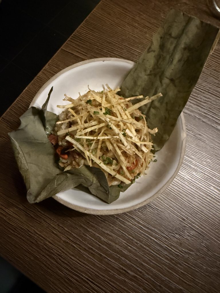 Eight Treasure Duck is the evening’s centerpiece, inspired by a traditional banquet dish in which a whole duck is stuffed with glutinous rice, chestnuts, lotus seeds, and other auspicious ingredients. Chin’s version arrives deconstructed but no less celebratory: a slice of tender duck with crisped skin, resting atop sticky rice studded with chestnuts and dried fruits, bathed in a glossy, aromatic sauce.